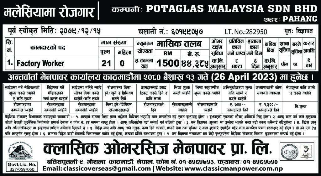 LT NO. 282950 – POTAGLAS MALAYSIA SDN. BHD. classicmanpowerApr 19, 2023 <span class="nav-subtitle screen-reader-text">Page</span> Previous PostGolden Kemuning Industries Sdn. Bhd. MalaysiaNext PostLT#285203 – Kuang Beng Plastic Industry Sdn. Bhd.LT Related Posts LT#270633 – FIRST UNITEX TYRE RETREADING SDN.BHD Classic OverseasMay 28, 2023 LT#285203 – Kuang Beng Plastic Industry Sdn. Bhd.LT Classic OverseasApr 21, 2023 Golden Kemuning Industries Sdn. Bhd. Malaysia LT No. 276083Chalan No: 60191851 Company: Golden Kemuning Industries Sdn.... classicmanpowerMar 3, 2023Mar 3, 2023 Leave a Reply Cancel replyYour email address will not be published. Required fields are marked *Comment * Name * Email * Website Save my name, email, and website in this browser for the next time I comment.