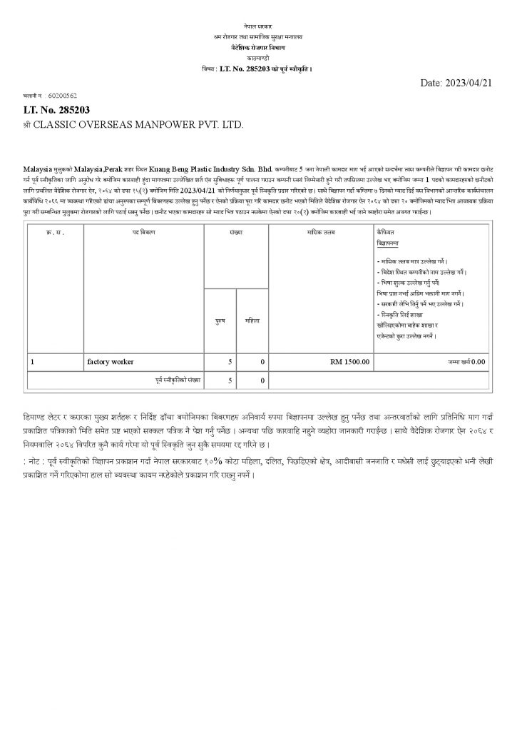 LT#270633 – FIRST UNITEX TYRE RETREADING SDN.BHD Classic OverseasMay 28, 2023 LT#285203 – Kuang Beng Plastic Industry Sdn. Bhd.LT Classic OverseasApr 21, 2023 Golden Kemuning Industries Sdn. Bhd. Malaysia LT No. 276083Chalan No: 60191851 Company: Golden Kemuning Industries Sdn.... classicmanpowerMar 3, 2023Mar 3, 2023