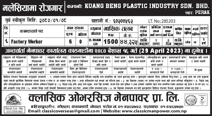 LT#270633 – FIRST UNITEX TYRE RETREADING SDN.BHD Classic OverseasMay 28, 2023 LT NO. 282950 – POTAGLAS MALAYSIA SDN. BHD. classicmanpowerApr 19, 2023 Golden Kemuning Industries Sdn. Bhd. Malaysia LT No. 276083Chalan No: 60191851 Company: Golden Kemuning Industries Sdn.... classicmanpowerMar 3, 2023Mar 3, 2023